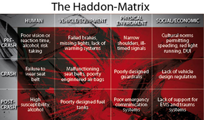 Here is a look at what some countries plan for their citizens! A country like USA decided to take a target of reducing road deaths by 20% in ten years; for UK, the target taken was 40%; Austria took 50%; and even a country like Malaysia took a target of bringing road deaths down to less than 3 per 10,000 vehicles! What about India’s targets? Well, what’s that? The government cares a damn if we are dying on the roads or of equally preventable diseases like diarrhoea. The United Nations actually puts road deaths in their public health agenda for it’s very clear that these deaths are massively preventable. UN’s global forecast, thanks to more and more cures for common diseases and more and more cars in irresponsible and unconcerned countries like India, shows road deaths becoming the third highest cause of premature deaths after ischemic heart disease and unipolar depression by the year 2020, replacing lower respiratory infections, diarrhoeal diseases and prenatal conditions, which occupied the top three slots in 1990 (a year when road deaths were ranked the 9th highest cause of premature deaths). About four decades back, in the US, William Haddon gave a simple 3×3 matrix called the Haddon matrix to show how to prevent road deaths. I am sure that in India, from the Roads and Transport Minister to the Commissioner of Traffic, none would have the slightest of ideas about that simple matrix (refer to figure). That, of course, was years back. Today, we have countries investing billions on research to reduce road deaths and coming out with technologies like alcohol sensors, seat belt alarms, automatic speed limiters etc.