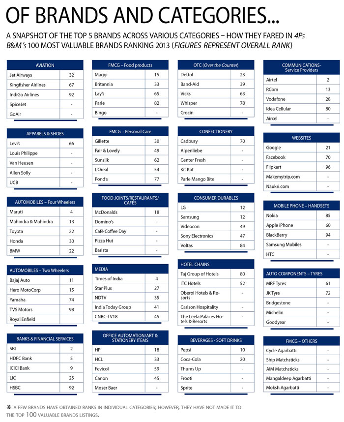 Respondents were asked questions on five parameters, based on which various brands were ranked in this year’s 4Ps B&M India’s 100 Most Valuable Brands ranking. The parameters and leading brands across respective parameters are…